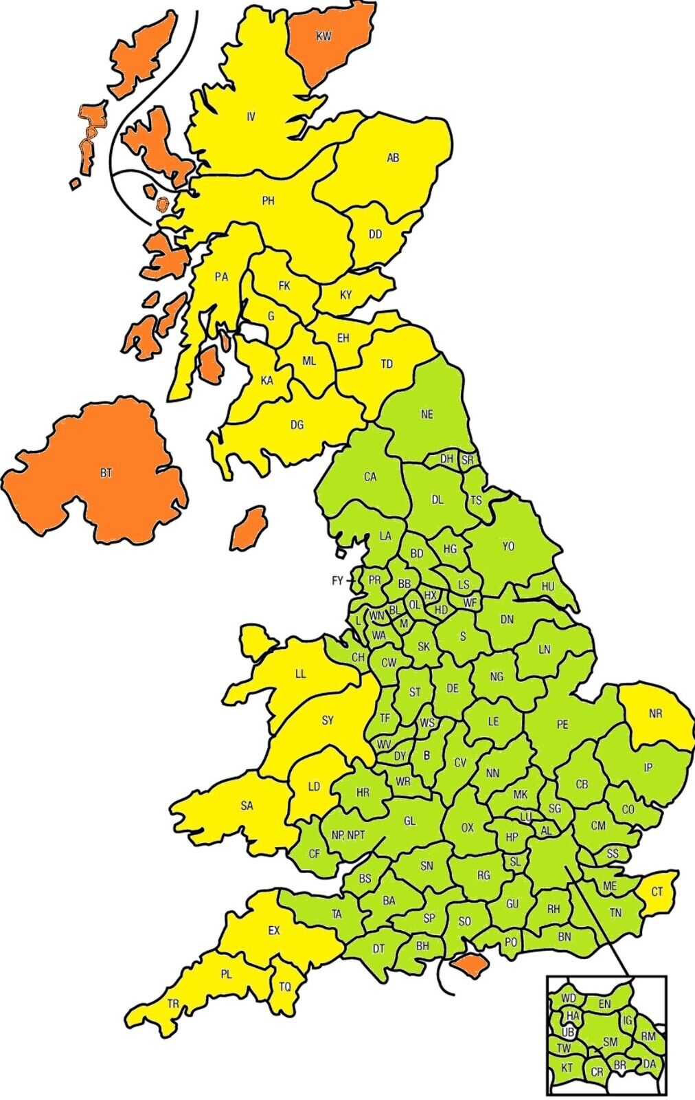 We offer delivery to most mainland UK postcodes. Please use the map below to identify your post code area.